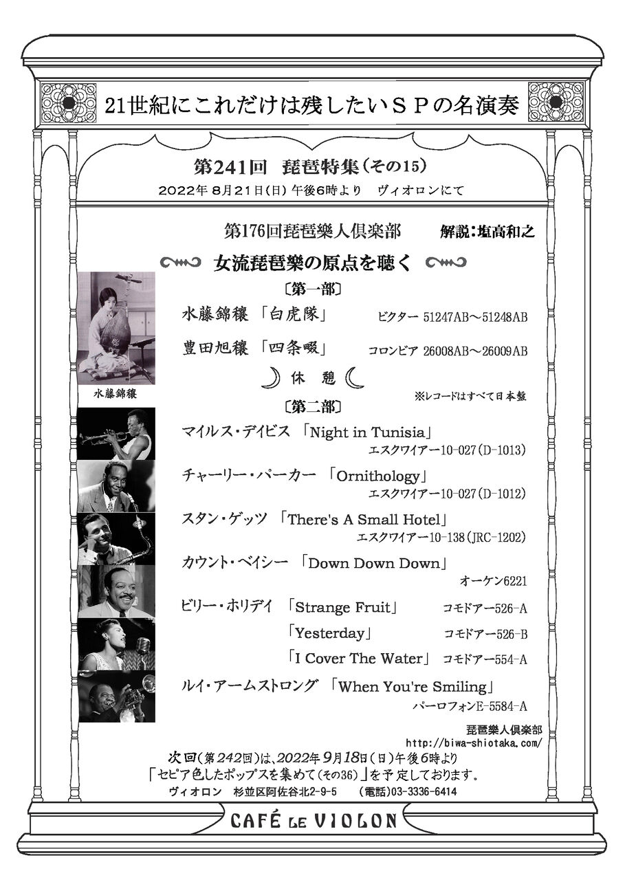 後半は、是迄同時代の声楽をかけて来ましたが、今回は同じ時代を駆け抜けたジャズを特集します。スウィングからビバップへと変わりゆく時代は、正に琵琶の最盛期と時を同じくし、世界の音楽の基盤となって行きました。こうご期待!