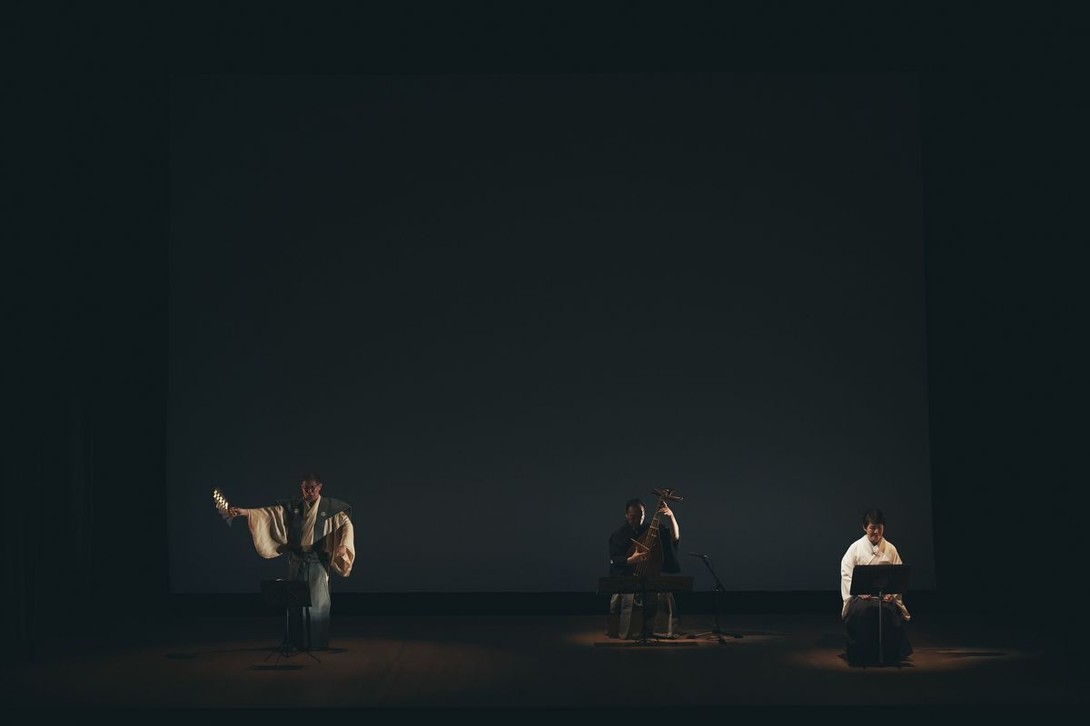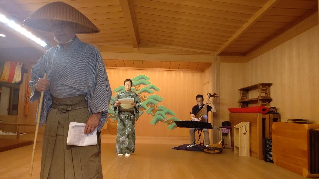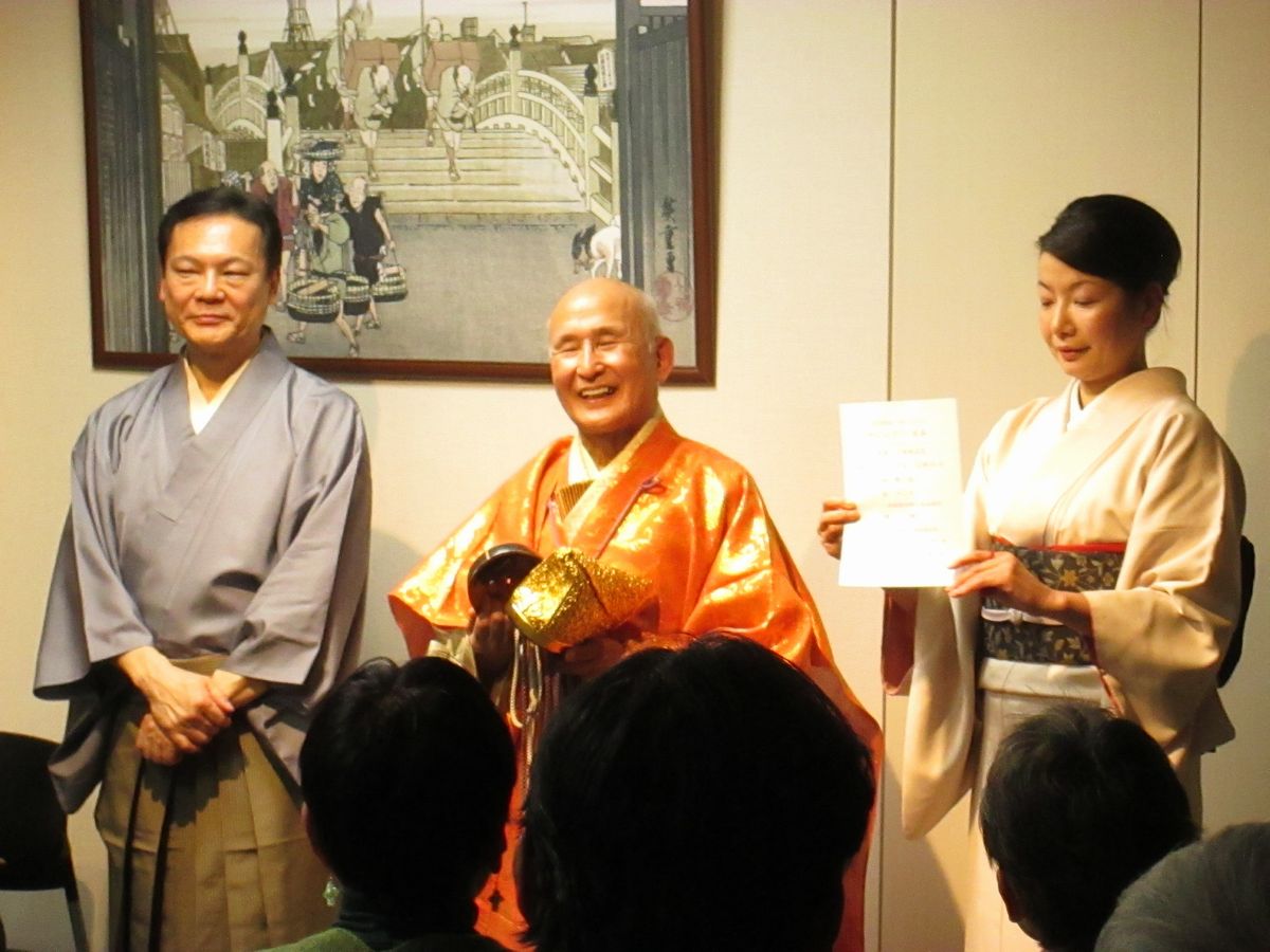 日本橋富沢町楽琵会にて、能楽師の津村禮次郎先生、筑前琵琶奏者の平野多美恵さんと