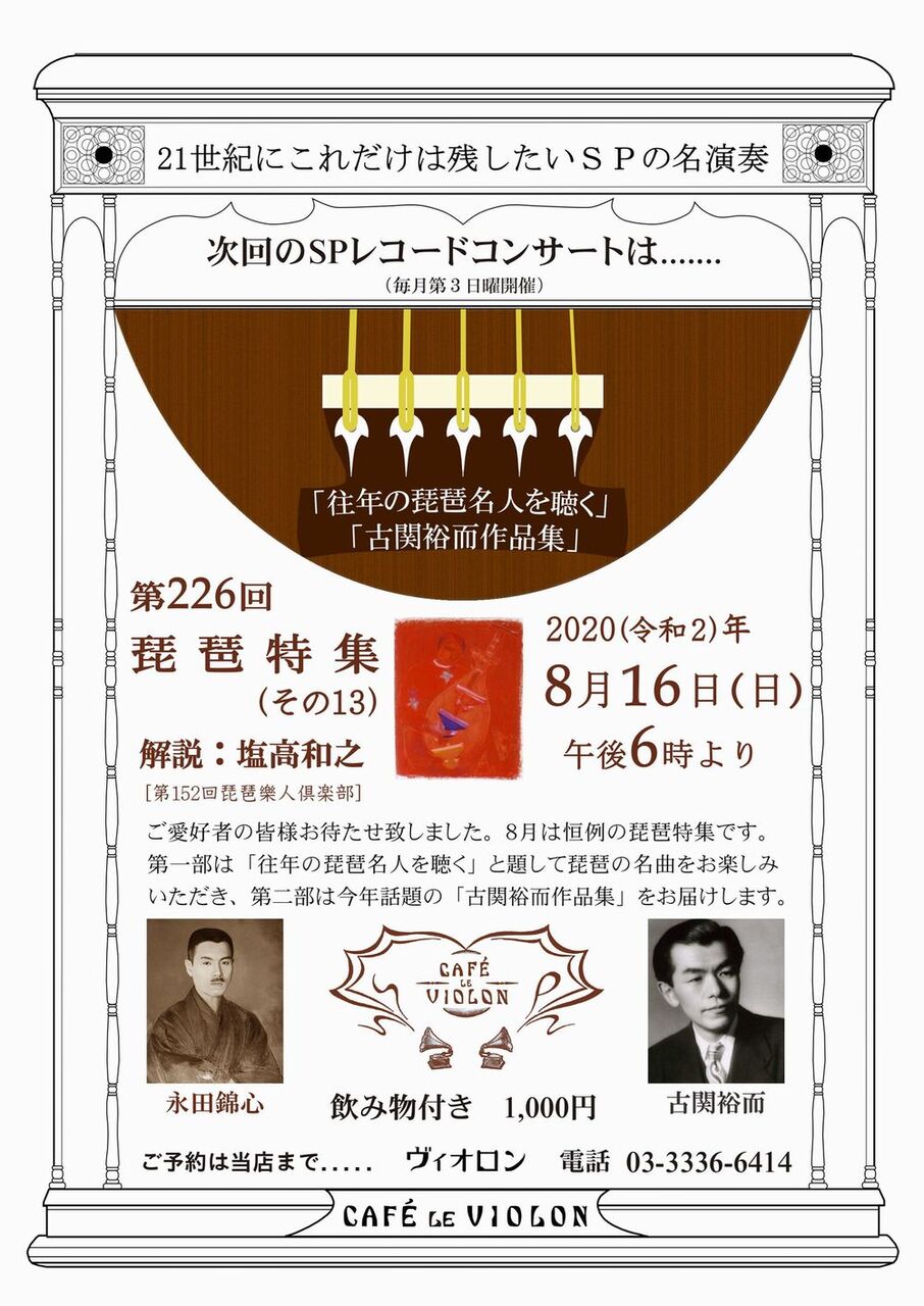 そして前後しますが、16日は夏恒例の琵琶樂人倶楽部SPレコードコンサートです。