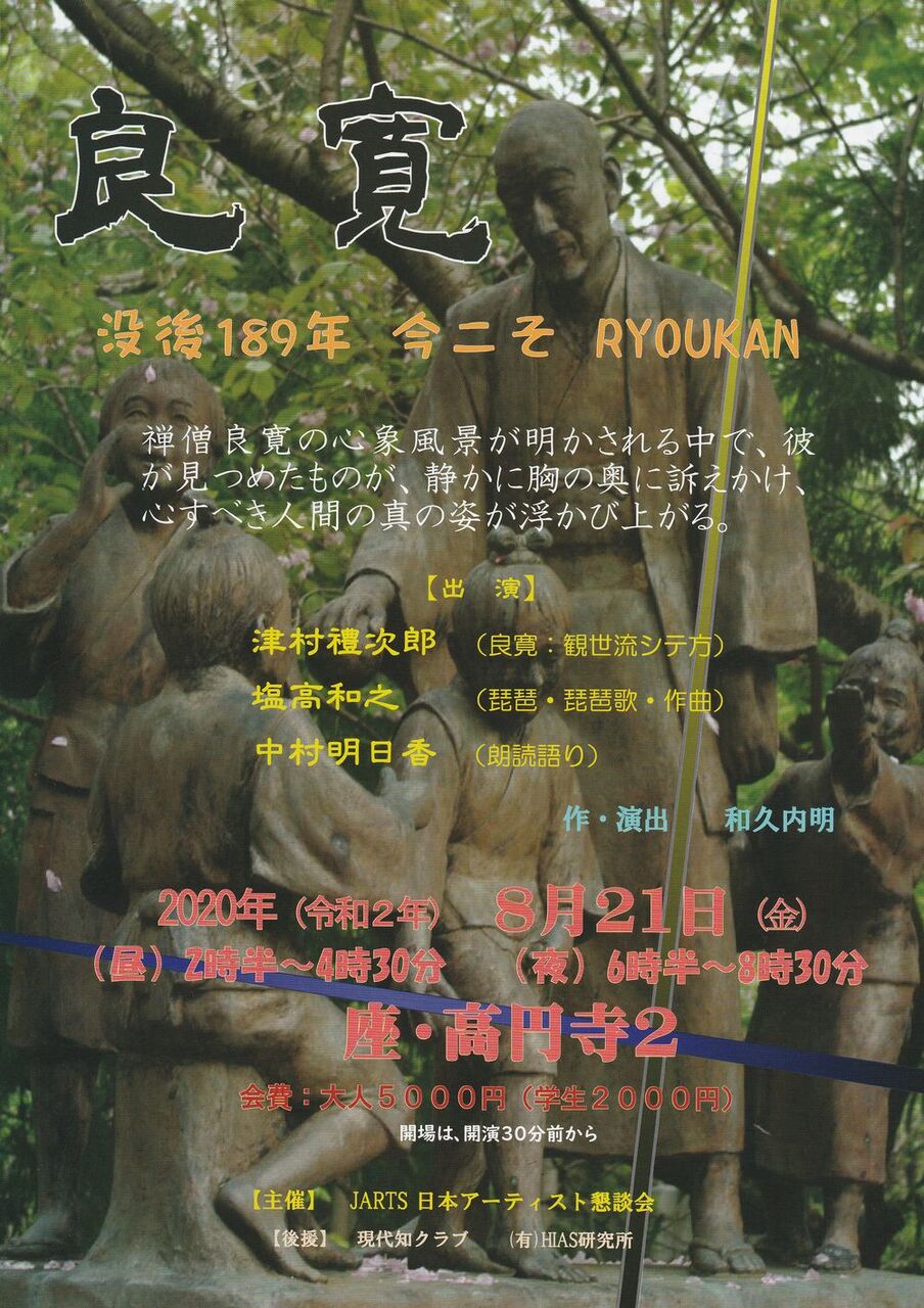 また今月は座・高円寺にて、戯曲公演「良寛」があります。和久内明先生の脚本で、共演は津村禮次郎先生、中村明日香さんです。これまで何度も上演してきましたが、今回は脚本がかなりすっきりして、良い感じに仕上がっています。8月21日、昼夜の二公演です。