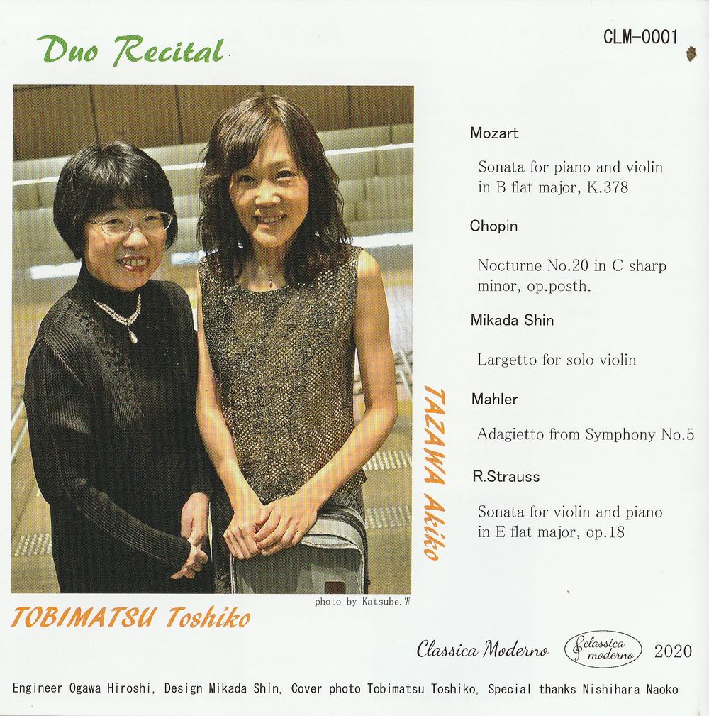 実は今月の日本橋富沢町楽琵会に田澤先生を迎える予定でした。また3月の頭には神奈川のお寺にて田澤先生とのデュオによる演奏会を予定していました。しかしそのいずれもが中止になってしまいましたので、今回急遽、琵琶樂人倶楽部の方にお呼びした次第です。田澤先生は今年CDをリリースしたばかり。そのタイトルも「Duo Recital」。ヴィスコンティの映画 「ベニスに死す」で使われた、マーラーの5番アダージェットも入ってます。いつもコンビを組んでいるピアノの飛松利子さんとの素晴らしいアルバムです。お寺の演奏会ではたっぷりとViのソロを弾いてもらう予定だったのですが、せめて今回はCDの紹介だけでもさせてもらいたいと思います。