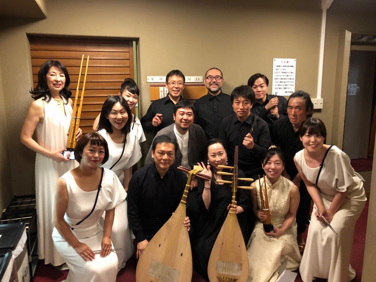 2018年6月国立劇場にて 正倉院の復元琵琶を使った新作初演終了時、演奏メンバーと