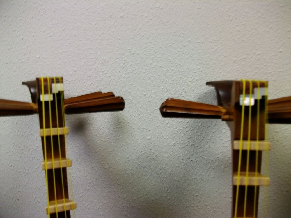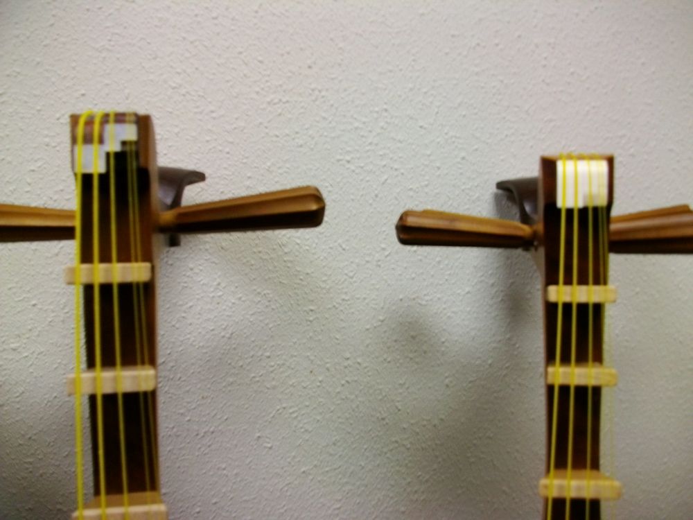 今回は、①糸口を象牙から貝プレートに交換、②柱の全取り換え、③覆手(テールピース)接着直し、④糸巻の調整もやってもらいました。