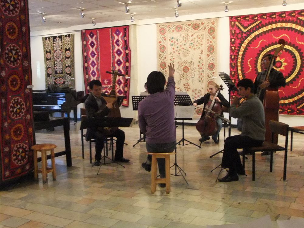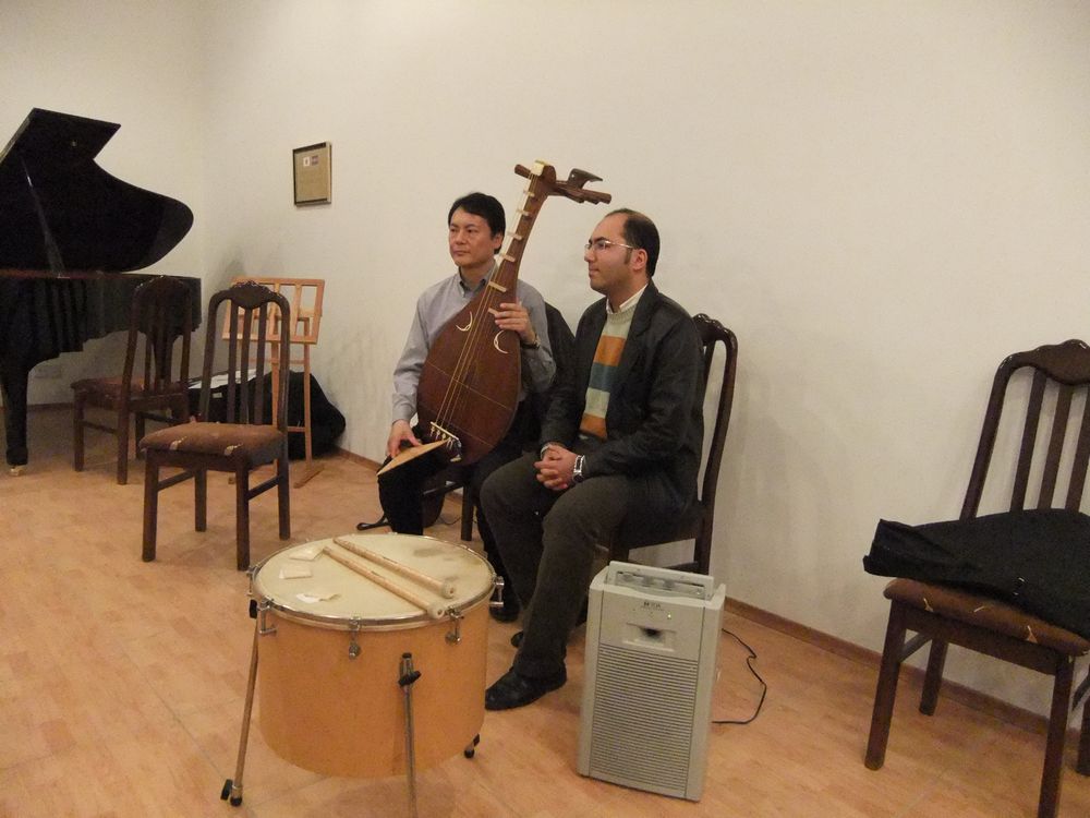 ウズベキスタン タシュケントのイルホム劇場にて。ネイの演奏家と「まろばし」リハーサル中。