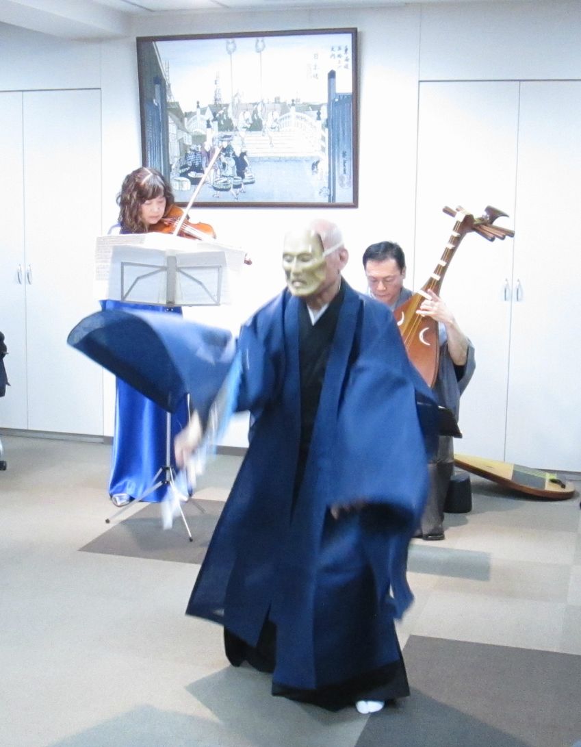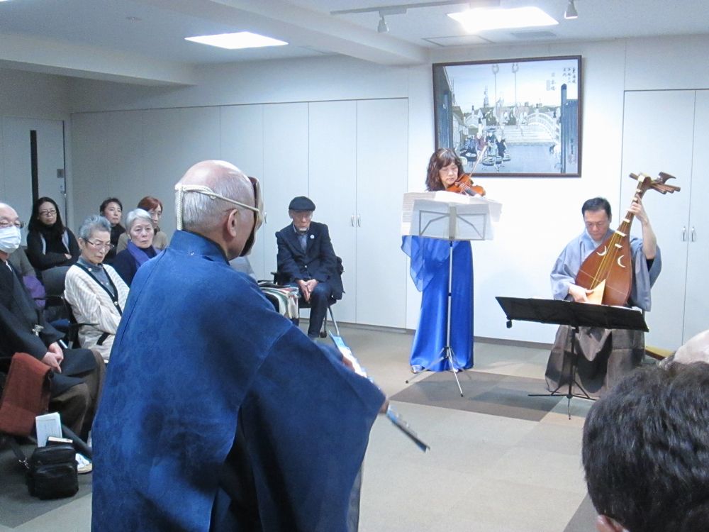 Vnの田澤明子さんと私で、9,11を題材とした「二つの月」を演奏し、そこに津村先生が舞をつけてくれました。この曲では、いつか津村先生と共演してみたいと思っていたので、今回は良い機会でした。来年は横浜能楽堂でも津村先生と共演の機会があります。ご期待ください。この日の津村先生はいつになく縦横無尽でした。やはり年末の日本橋富沢町楽琵会は格別ですな。勿論来年もお願いいたしました